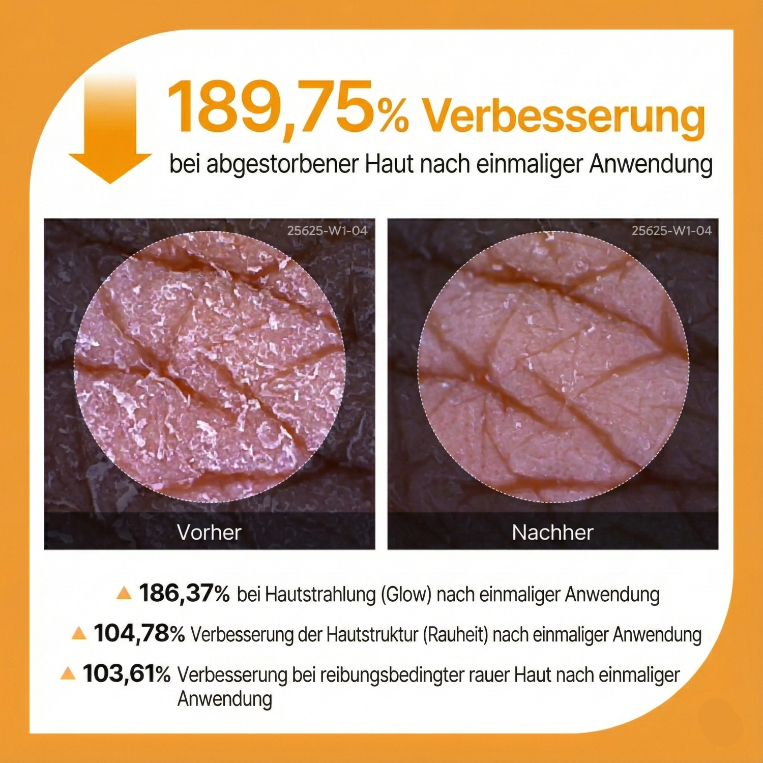 Wann sehe ich Ergebnisse?Viele bemerken bereits nach der ersten Anwendung ein weicheres, glatteres Hautgefühl. Ein gleichmäßigerer Hautton und eine Reduzierung der KP-Unreinheiten treten typischerweise bei regelmäßiger Anwendung innerhalb von 2–4 Wochen auf.